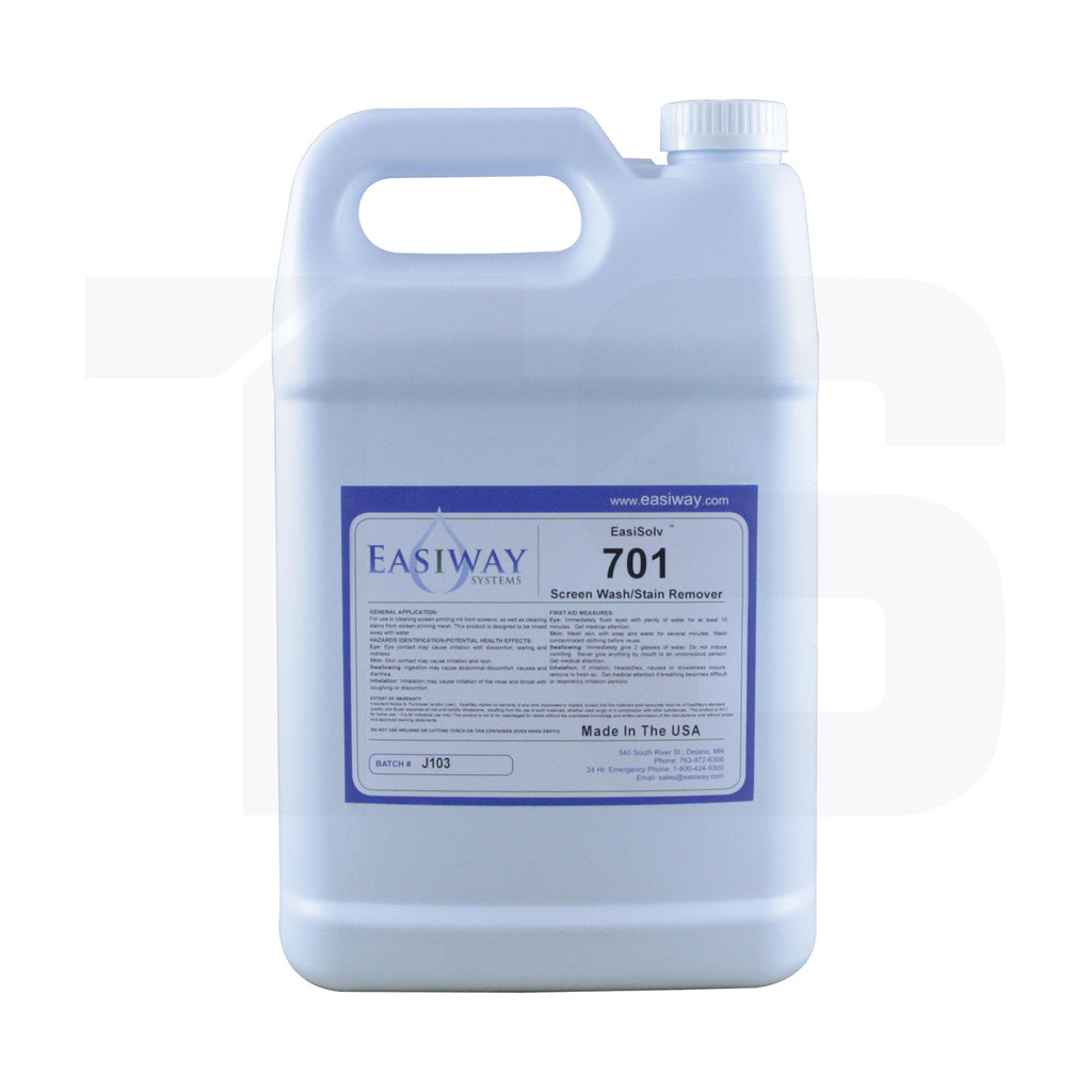 EasiSolv䋢 701N Screen Wash and Stain Remover (with degreasers) is an environmentally approved, 100% active, low odor, extremely quick penetrating, and fast-acting solvent designed to dissolve and clean virtually all types of screen printable inks, adhesives, clear coatings, and stains from printing mesh. Plastisol, UV/solvent, conductive and industrial inks are quickly dissolved with EasiSolv 701N without the hazards and odors usually associated with aggressive solvents and caustic stain/haze removers. EasiSolv 701N works quickly and causes no damage to printing mesh when used as a stain remover.