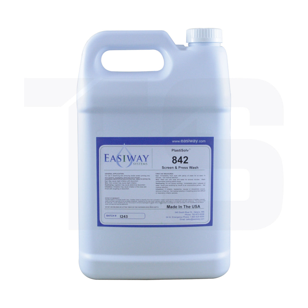 PlastiSolv 842 Press Wash is an environmentally approved, 100% active, virtually odor free textile ink remover which can be effectively used at the press and in the reclaim area. PlastiSolv 842 Press Wash cuts ink fast and quickly dries for on press color changes, screen opening or saved screens.